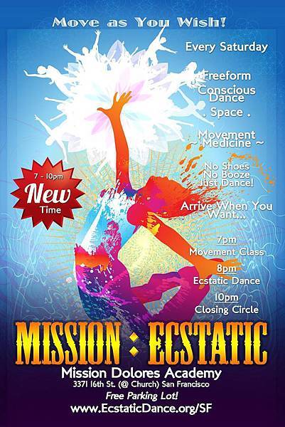 一般而言,很難找得到理想中ecstatic dance的環境。一方面因為語意模糊,再來名字即使相同,實際場合的氛圍文化也因人因地而異。所以,擴大範圍,尋找以健康、嘗試為宗旨的freeform dance還比較容易在舞蹈教室中尋得。再不然,就是在最大眾化的舞池舞廳中,尋找精神相通的地點:去跳舞、不是去品頭論足,去探索、不是去表現的舞廳,也是有的。
